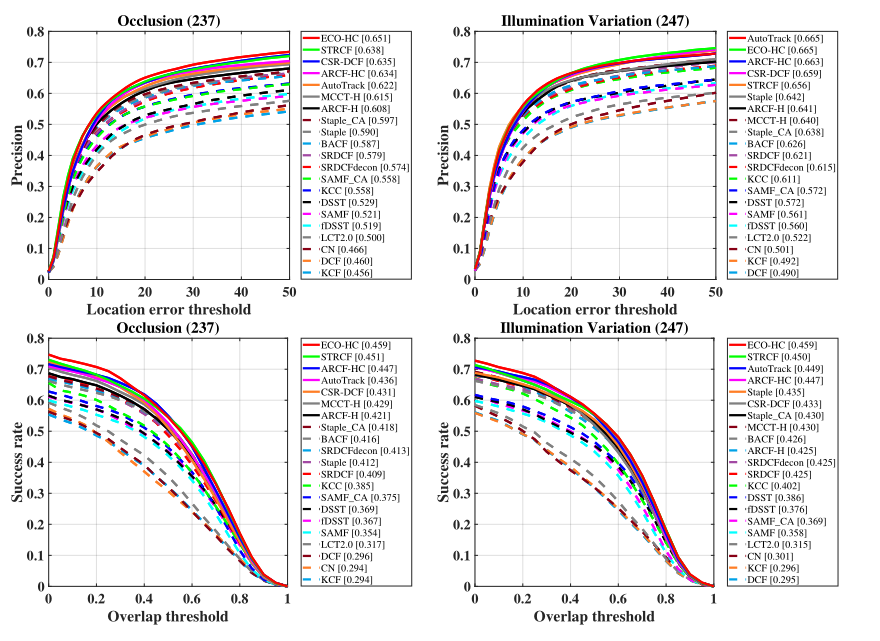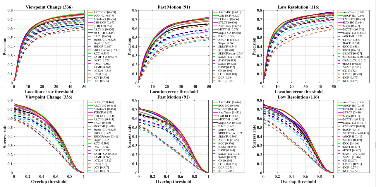 基于上述工作,每个跟踪器在新属性下的跟踪结果也被绘制成包含成功率图和精度图的十个图,如图7所示。注意,采用的计算方法是按序列平均,即统计六个基准中所有序列中包含特定属性的序列,所涉及序列结果的算术平均值作为最终结果。图7显示,追踪器在特定属性下的表现明显差于各基准中的整体表现,各追踪器擅长的挑战也各不相同。总体而言,ARCF-HC追踪器[24]在FM和VC方面表现最好,AutoTrack追踪器[22]在VC和IV方面表现良好,ECO-HC [95]追踪器在闭塞问题上排名第一。