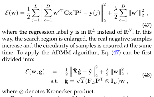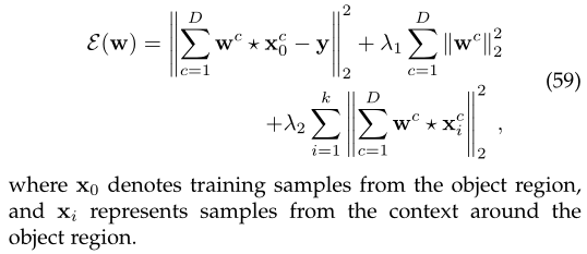 在CACF跟踪器中,在训练阶段,作者改变了原来的岭回归公式Eq。(3)至:
