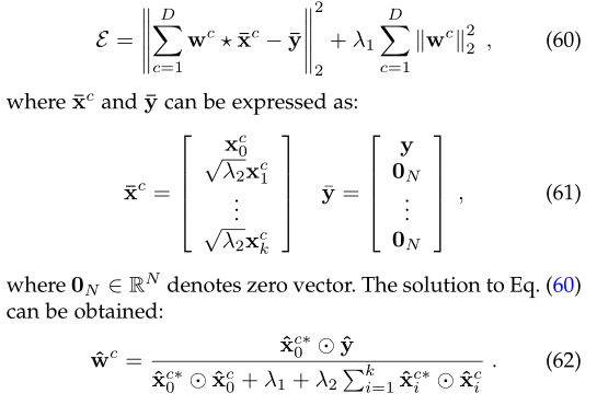 备注1:为了推导方便,本工作将某个特征通道的训练样本和滤波器考虑为一维,即大多数情况下xc,wc ∈ RN。在实现的代码中,样本和滤波器是具有长度和宽度的二维矩阵,导出的结果可以推广到二维。