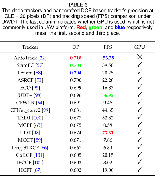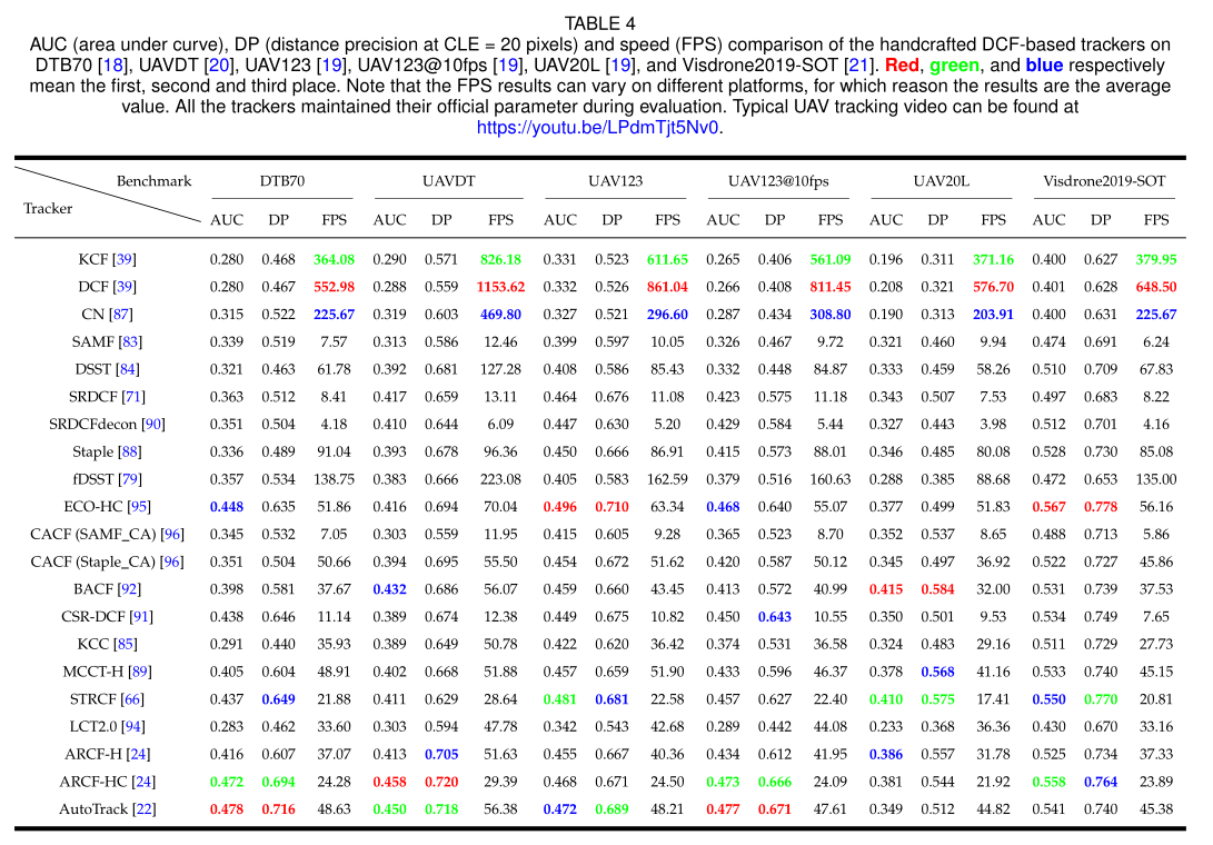 在所有使用手工特征的基于DCF的跟踪器中,在未调整参数的情况下,三个跟踪器,即AutoTrack跟踪器[22]、ARCF-HC跟踪器[24]和ECO-HC跟踪器[95]在六个基准中在成功率(AUC)和精度(DP)方面比其他跟踪器获得了更多的前三值(在表4中用特殊颜色,红色、绿色和蓝色标出)。这表明即使在固定参数的情况下,它们在各种复杂场景下仍然具有很好的通用性,进一步证明了它们在现实世界无人机跟踪中的实用性。