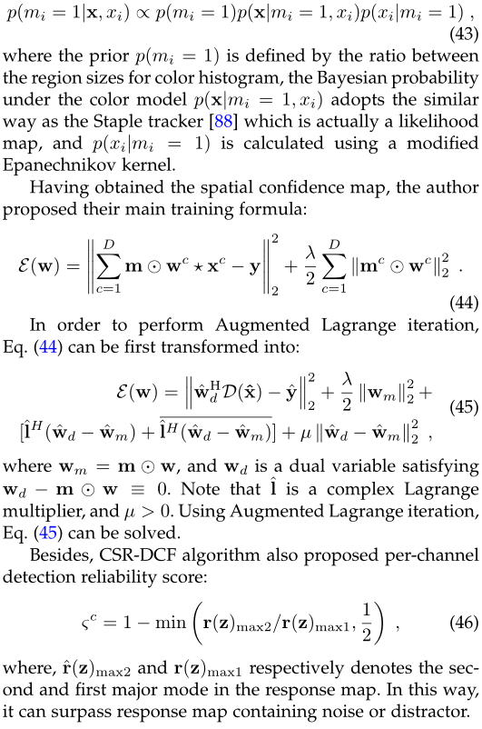 以确保过滤器学习更准确的具有不规则形状的物体信息,并削弱不可靠的特征通道。A. Lukezic等人对CSR-DCF tracker [91]中的SRDCF tracker [90]进行了出色的改进,将固定的空间惩罚项ω改为逐像素的置信度图m,并引入信道置信度得分来修改生成的响应图。