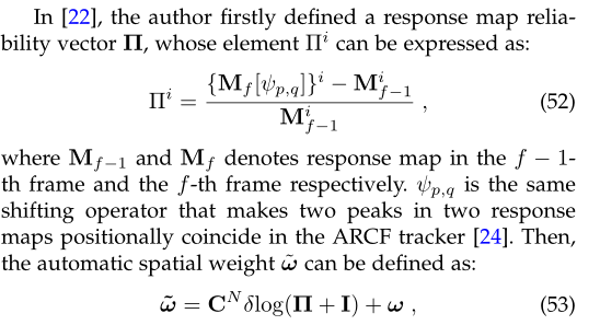 备注13:不同于以往利用当前响应图的可靠性来抑制后续帧中相应位置的方法,如CSRDCF跟踪器[91],ARCF跟踪器首次将响应图畸变引入训练公式,抑制了训练阶段可能出现的噪声,并取得了相当可观的效果。