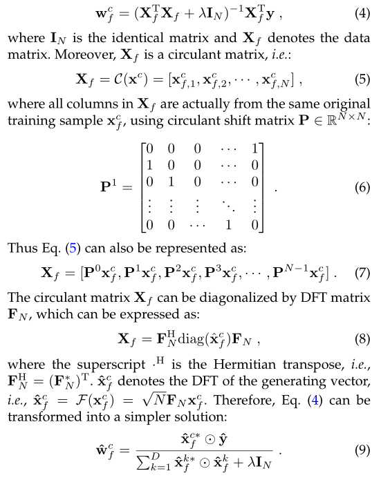 基于DCF的跟踪器的核心思想是通过最小化标签之间的损失以及样本和过滤器之间的循环相关性来训练具有对搜索样本进行分类和评分的能力的过滤器。过滤器对搜索样本的分类结果可以使用下面的公式获得: