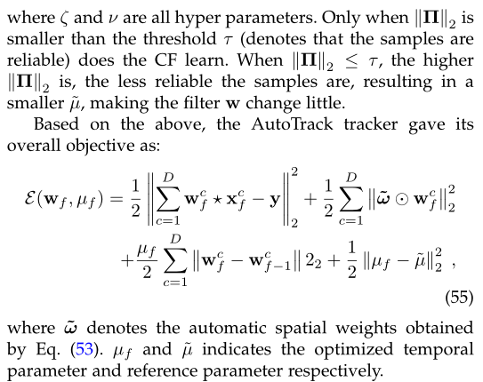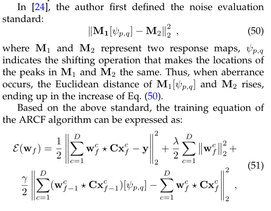 其中,第一项中的矩阵C是BACF跟踪器[92]中的裁剪矩阵,第二项是与KCF跟踪器[39]相同的常规项,第三项旨在抑制第f帧相对于第f1帧可能出现的响应图异常。最后,ARCF跟踪器采用ADMM迭代算法求解方程。(51).