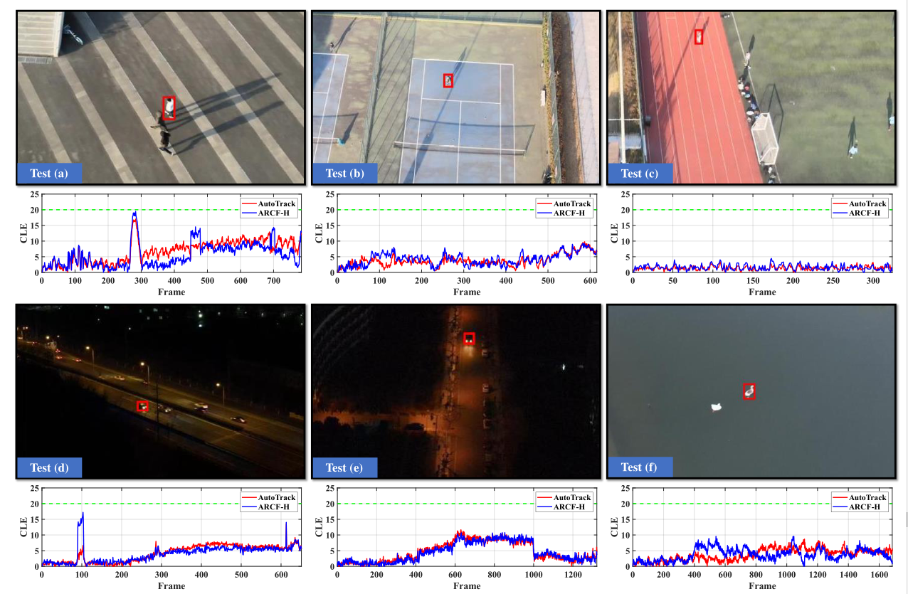 图10,中心定位误差(CLE)方面的机载跟踪性能。六个测试(a)、(b)、(c)、(d)、(e)和(f)中,跟踪目标用红框标出,包含了上述常见的无人机跟踪挑战。显示的令人满意的CLE结果验证了AutoT rack [22]和ARCF-H [24]跟踪器在具有挑战性的真实世界无人机跟踪中的鲁棒性。为了更好的显示效果,请参考本文的电子版。