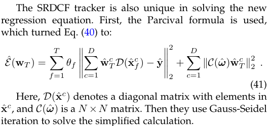 SRDCF跟踪器是相关滤波器跟踪器发展中的一个里程碑。它用空间罚项补充了KCF岭回归主公式,并用高斯-塞德尔迭代法求解。实验证实,SRDCF算法使滤波器能够学习更多的负样本,从而提高了跟踪的鲁棒性,这已经成为后续CF跟踪器的流行基线。