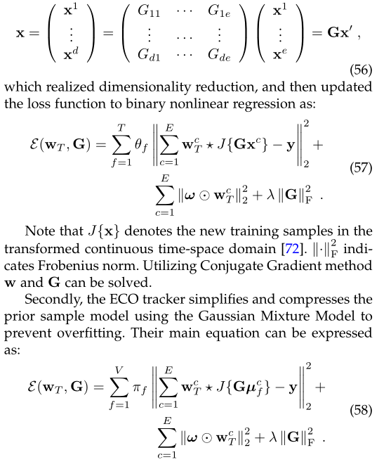 首先,ECO追踪器减少了特征维数以提高速度。原始的D维降低为E维样本,引入矩阵G表示原始样本如下: