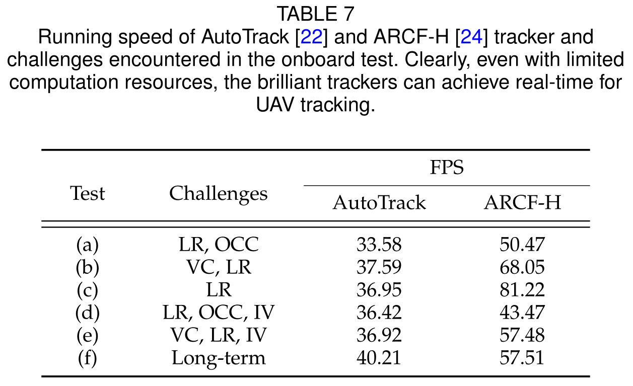 6,计算资源稀缺:由于有限的电源和有效载荷问题,大多数UA Vs只使用单个CPU作为计算平台,极大地限制了处理速度。为了满足无人机跟踪的实时性要求,需要精心设计方法,在不牺牲高效率的前提下实现鲁棒跟踪。此外,算法需要足够轻,以便为耗能应用(如无人机在复杂环境下的机动飞行)留下更多电源。