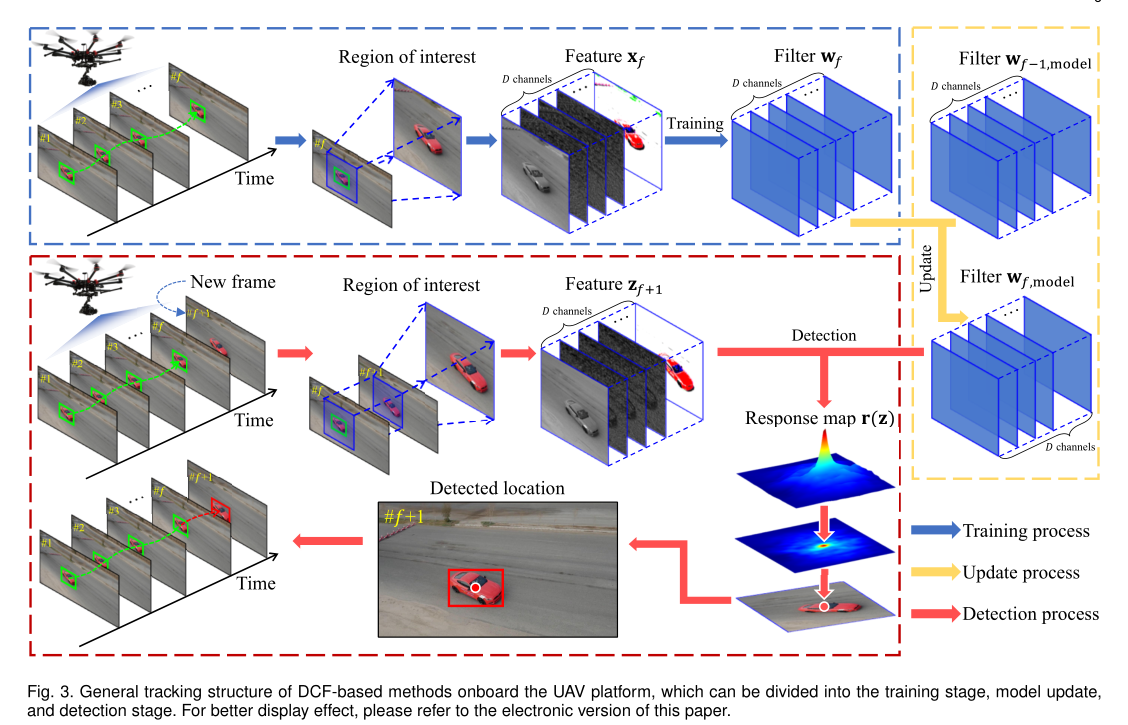 到了这里,基于DCF的追踪器使用Eq。(9)对于滤波器训练,Eq。(10)用于模型更新和等式。(11)用于物体检测。由于方程中的大部分计算是基于元素的,基于DCF的跟踪器减少了存储和计算与岭回归问题的传统解法相比提高了几个数量级。基于DCF的方法将跟踪算法提高到了一个新的水平,在满足速度的同时,大大提高了鲁棒性和准确性,从而成为无人机跟踪领域的主流方法。