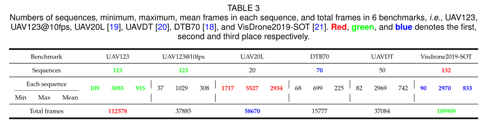 表3显示了序列的数量、每个序列中的最小、最大、平均帧数以及6个基准中的总帧数。