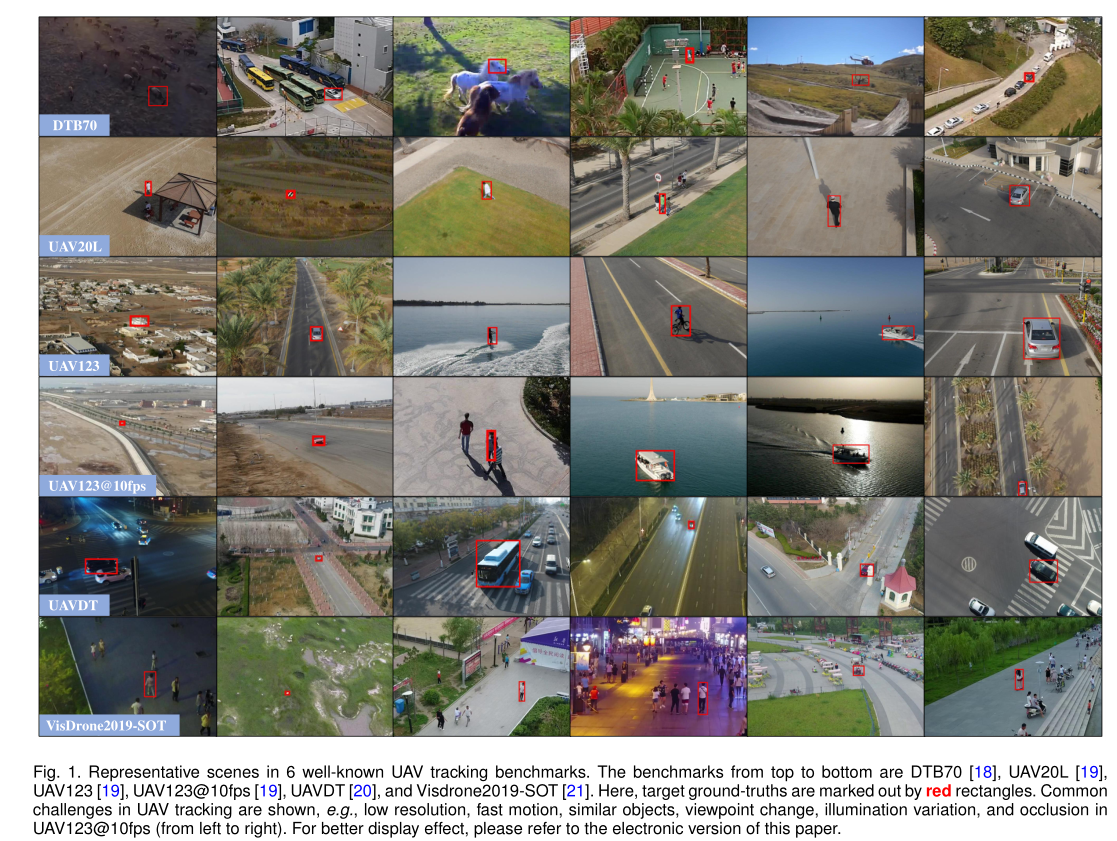 图1显示了具有代表性和挑战性的基于无人机的空中跟踪场景。鉴于上述挑战,研究和开发一种快速、鲁棒的视觉跟踪方法对于基于无人机的遥感应用的广阔前景是非常关键和有价值的