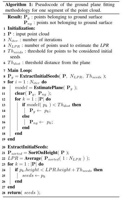 如Alg. 1主回路所示,对于每一个点云段,地面拟合从确定性提取一组低高度的种子点开始,然后用这些种子点估计地面的初始平面模型。对点云段P中的每个点根据估计的平面模型求值,得到点到候选平面上的正交投影的距离。此距离与用户定义的阈值Th区进行比较,后者决定该点是否属于地面。将地面上的点作为种子,对一个新的平面模型进行精细估计,这个过程重复N iter次。最后,将该算法得到的每个点云段的地面点进行拼接,得到整个地平面。
