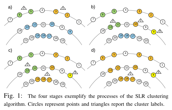 图1 这四个阶段说明了SLR聚类算法的过程。圆圈表示点,三角形代表类别标签。