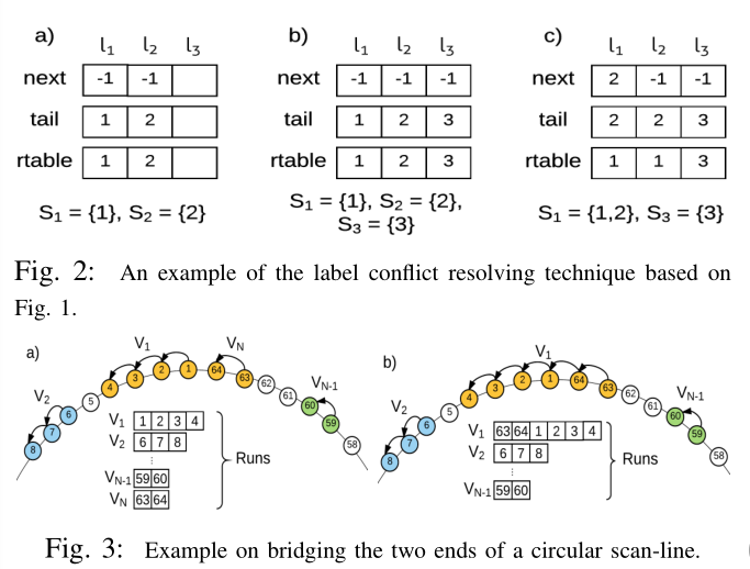 当需要合并两个或多个不同的已标记组件时,会出现标签合并冲突。根据He等人的[13],解决方案是通过在相同的集合S中积累它们的标签l,并使用复杂的方法用三维一维数组捕获它们的层次结构和连接。这三个向量的大小都与第一次通过点云时创建的标签总数相同。第一个向量“next”的每一项都在它的S中存储下一个l,而S中最后一个l的项是-1。接下来,向量“tail”存储s的最后一个l的索引。最后一个向量“rtable”的辅助作用是报告任意给定时刻每个l的最终标签是什么。在第一次遍历结束时,rtable用作最终标记的查找表。