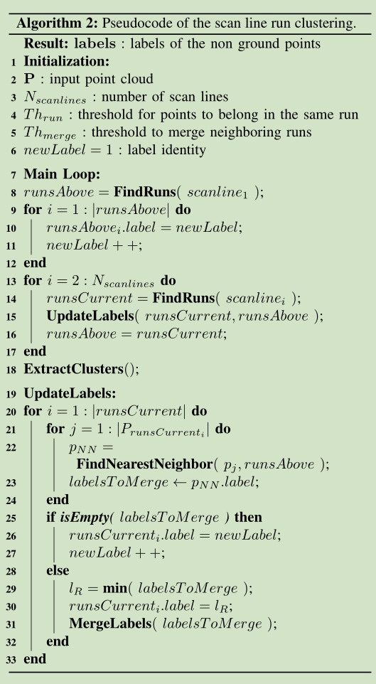 我们把由同一激光雷达环产生的一层点称为扫描线。在每个扫描线中,它的元素被组织在称为运行的连续点的向量中。运行中的元素共享相同的标签,并且是集群的主要构建块。