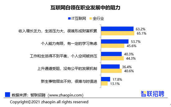 根据智联招聘调研数据显示,相对于全行业整体情况,互联网从业者压力更大。互联网从业者身处新产品、新模式层出不穷的互联网行业,倍感时代压力,面对新事物在技能提升,感到“个人能力有限,有一定的学习焦虑”和“新生事物层出不穷,很难与时俱进”等方面的压力,自然会比其他行业的强。