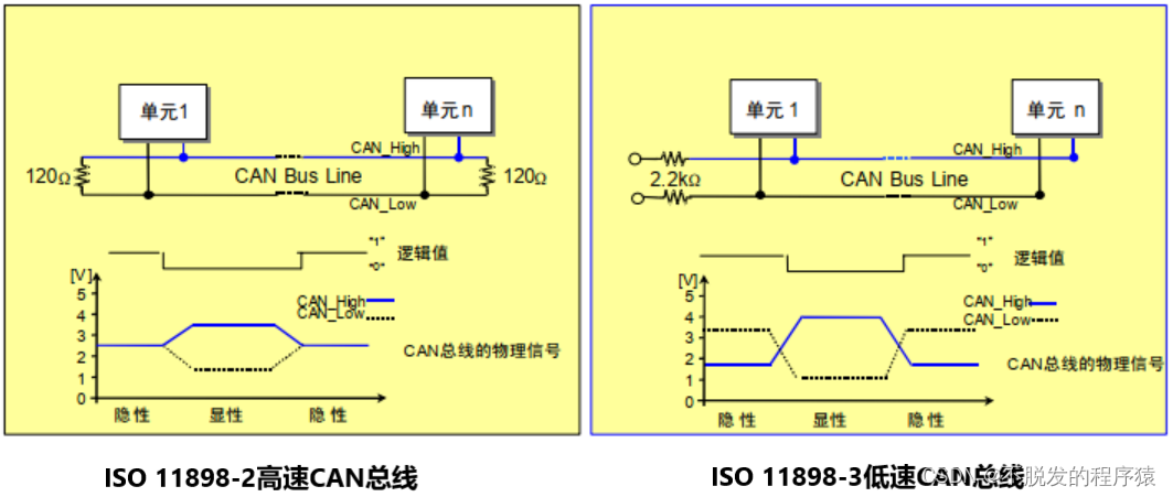 在ISO 11898-2和ISO 11898-3中分别规定了两种CAN总线结构(在BOSCH CAN2.0规范中,并没有关于总线拓扑结构的说明)。