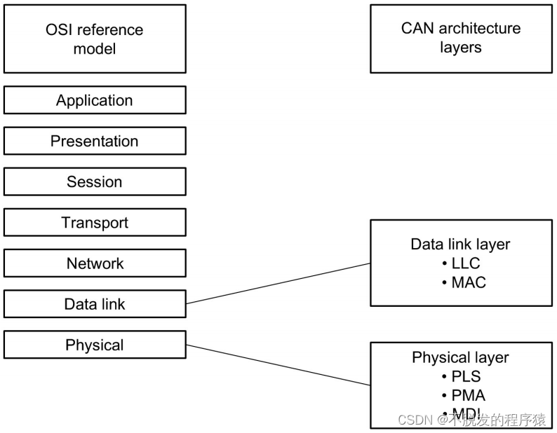 CAN通讯协议标准(ISO-11898:2003)介绍了设备间信息是如何传递以及符合开放系统互联参考模型(OSI)的哪些分层项。实际CAN通讯是在连接设备的物理介质中进行,物理介质的特性由模型中的物理层定义。ISO11898体系结构定义七层,OSI模型中的最低两层作为数据链路层和物理层,如下图所示: