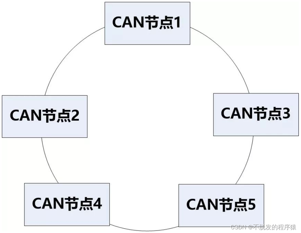 环形拓扑是将CAN总线头尾相连,形成环状,其优点是线缆任意位置断开,总线都不会出现问题,缺点是信号反射严重,无法用于高波特率和远距离传输,如下图所示: