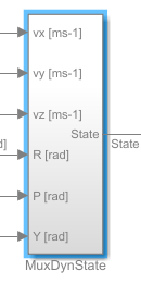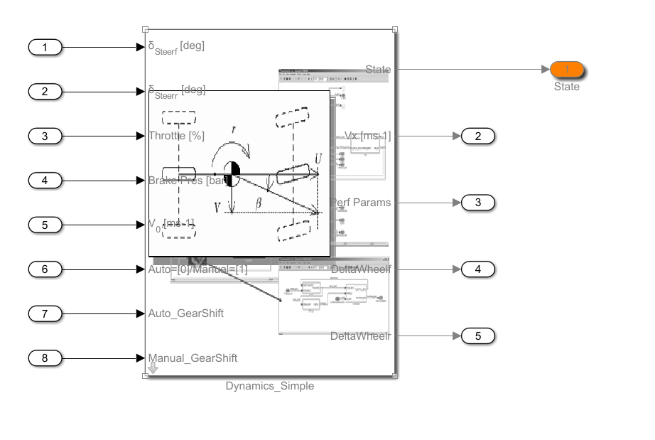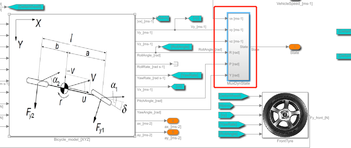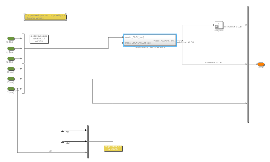 [3 3 3] -> [x y z vx vy vz roll pitch yaw] 其中 roll 与 pitch 为接地为0,所以这个模拟的是2D的动力学模型,不仿真roll 与 pitch,如果想仿真prescan中3D的动力学模型,则需要如法炮制,寻找相对关系