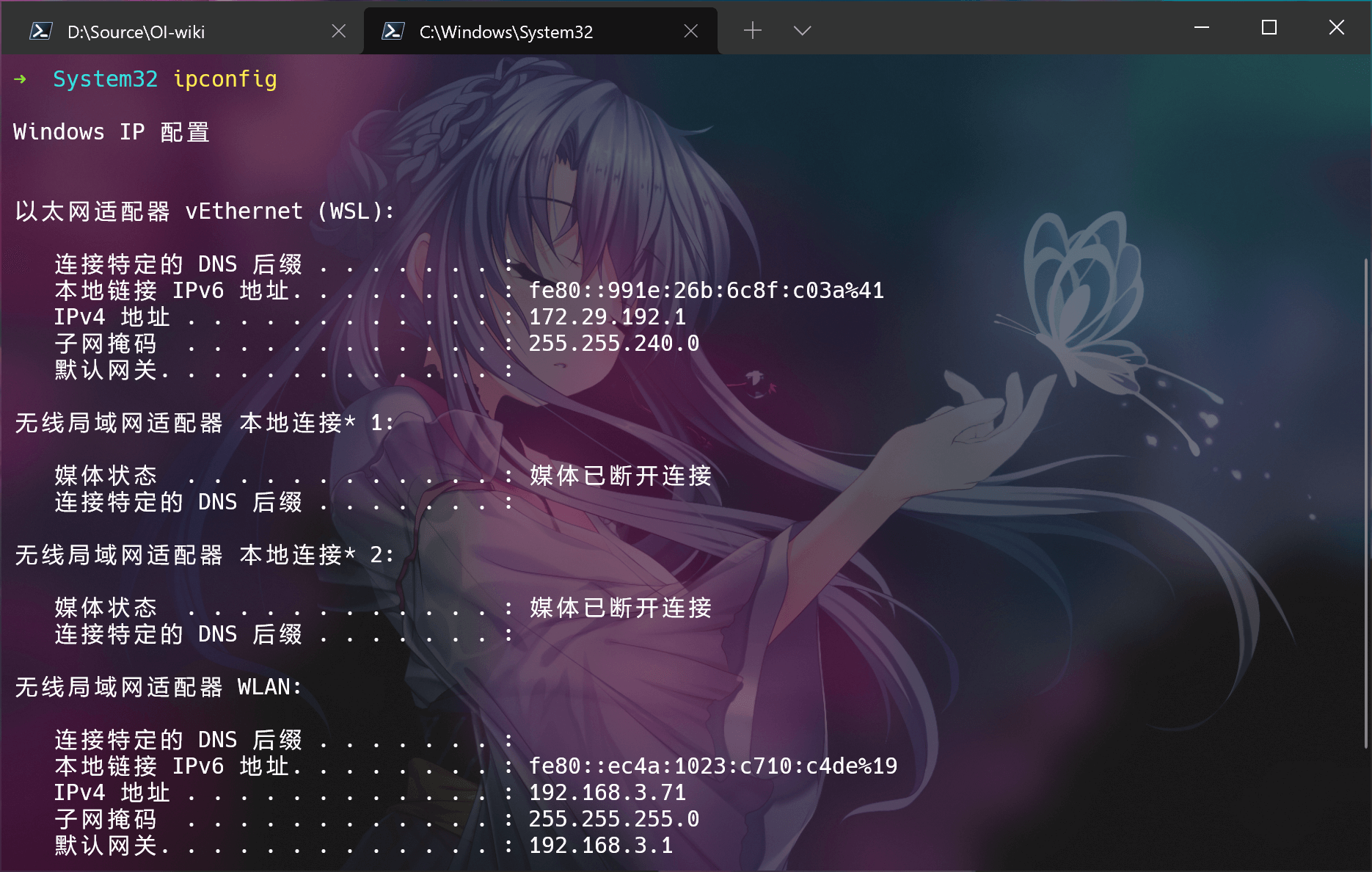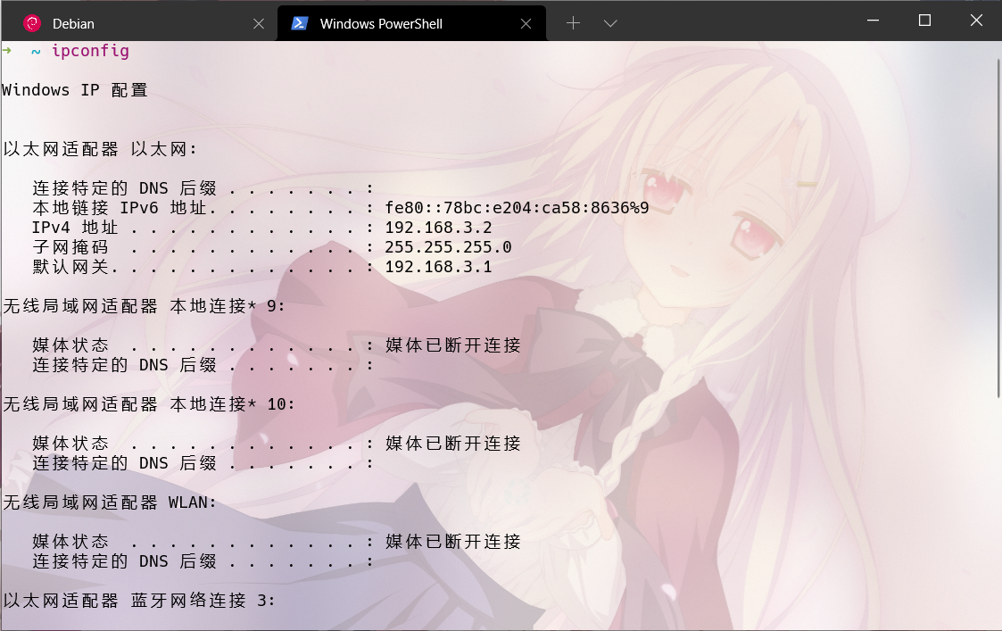 再 Powershell 中输入 ipconfig 查询本机的 IP 信息: