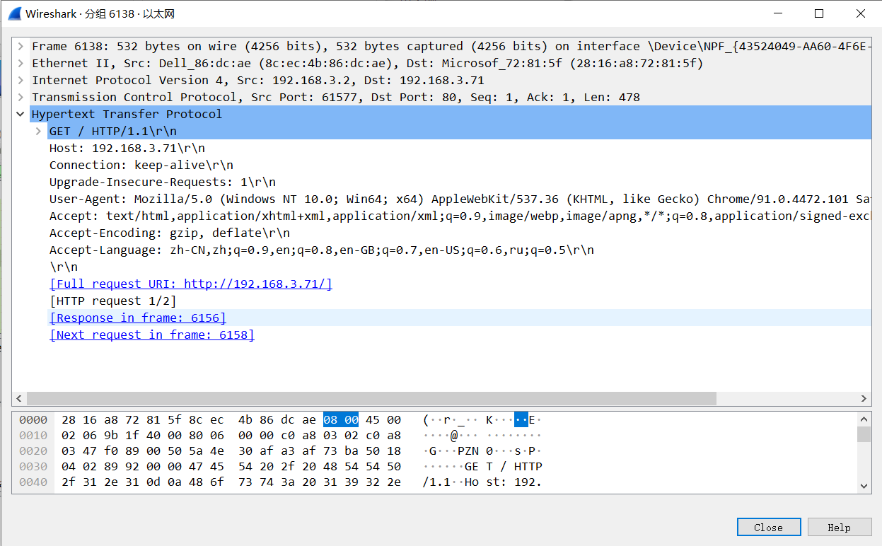 浏览器访问上面查询到的服务器的地址 http://192.168.3.71,并且在 Wireshark 中设定限制条件(过滤器) ip.src == 192.168.3.71 or ip.dst == 192.168.3.71 来只捕获来自这两个 IP 地址之间的通信。