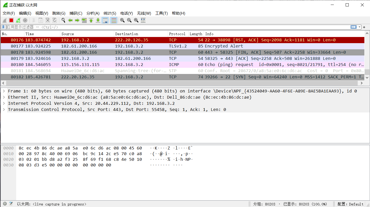 然后,就可以开始捕获以太网的通信数据包: