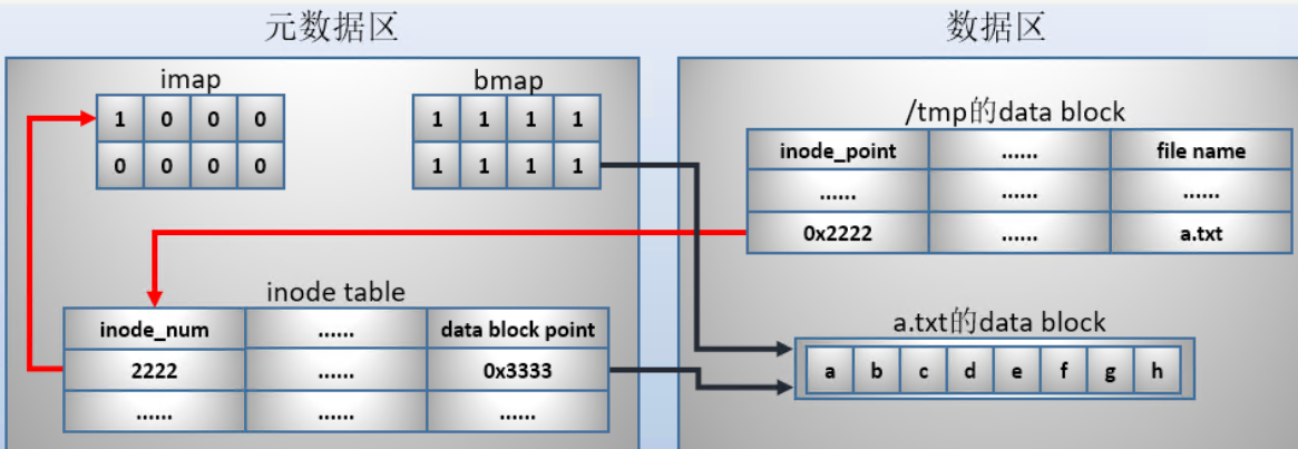 - (3).删除父目录/tmp的data block中关于a.txt的记录。这里只要一删除,外界就看不到也找不到这个文件了。