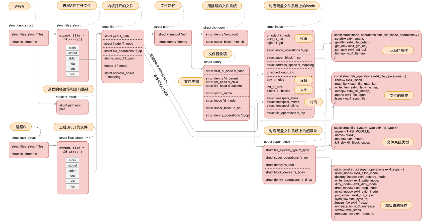 这张图表示了文件操作在各个层的数据结构的关联,能对着这张图将它们之间的关系讲清楚,对于文件系统的部分,你就会了然于心了。