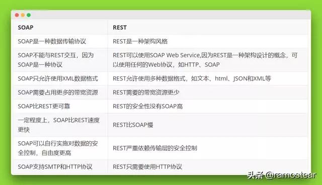 下面,通过一张表格来对比REST与SOAP之间的异同: