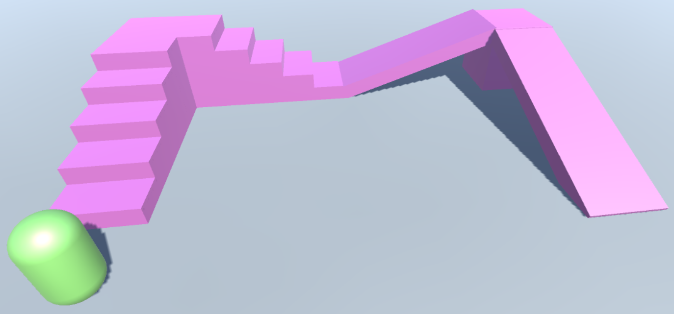 创建 2 个楼梯(每个楼梯由 5 个 Cube 对象拼成)和 2 个斜坡以及一个胶囊体,如下: