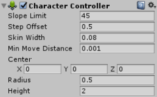 CharacterController 继承 Collider(见→碰撞体组件Collider),其属性面板如下: