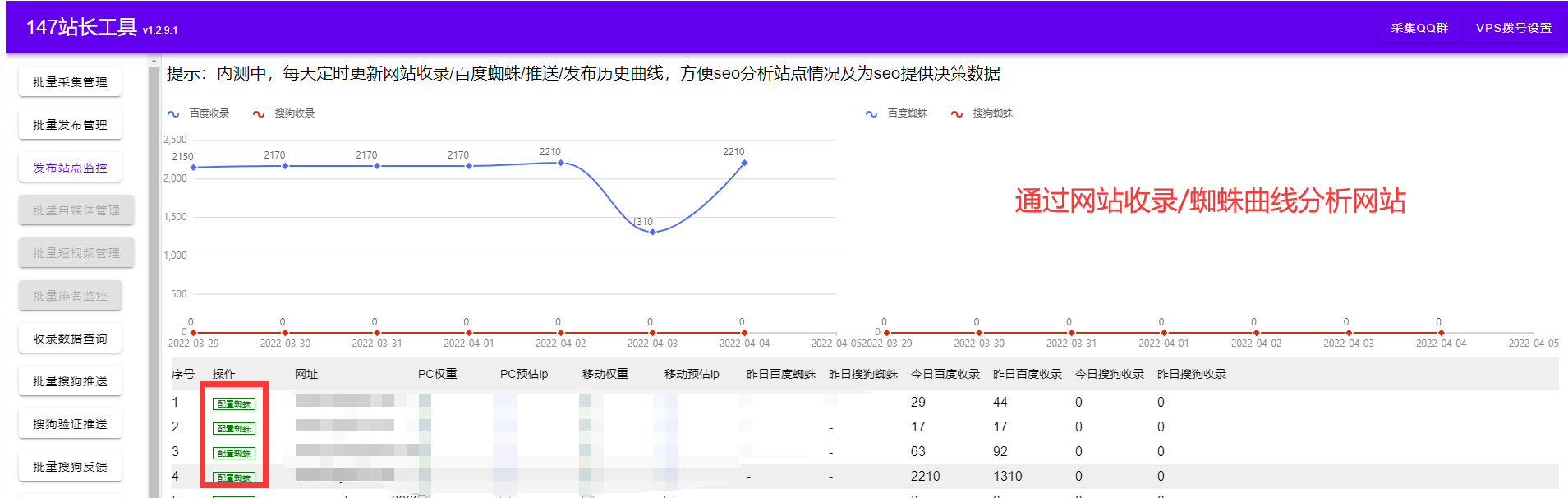 只需要导入域名即可实现网站批量监控管理,该免费工具不仅能批量监控网站数据,还能自动文章更新、自动文章清洗、自动伪原创、自动推送给搜索引擎收录排名(详细参考图一、二、三、四)