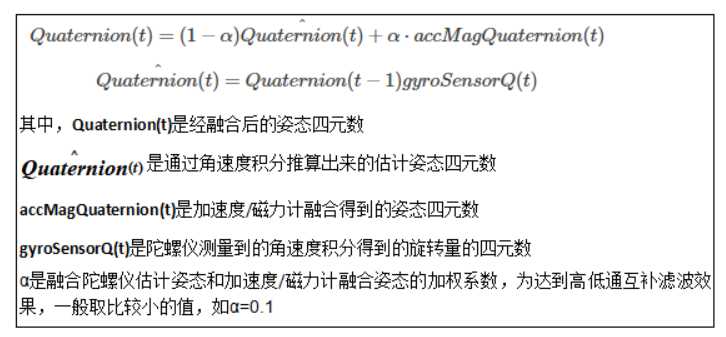 完成数据的校准以后,利用高低通互补滤波、扩展卡尔曼滤波EKF、Mahony滤波中的一种实现姿态数据融合,获取四元数