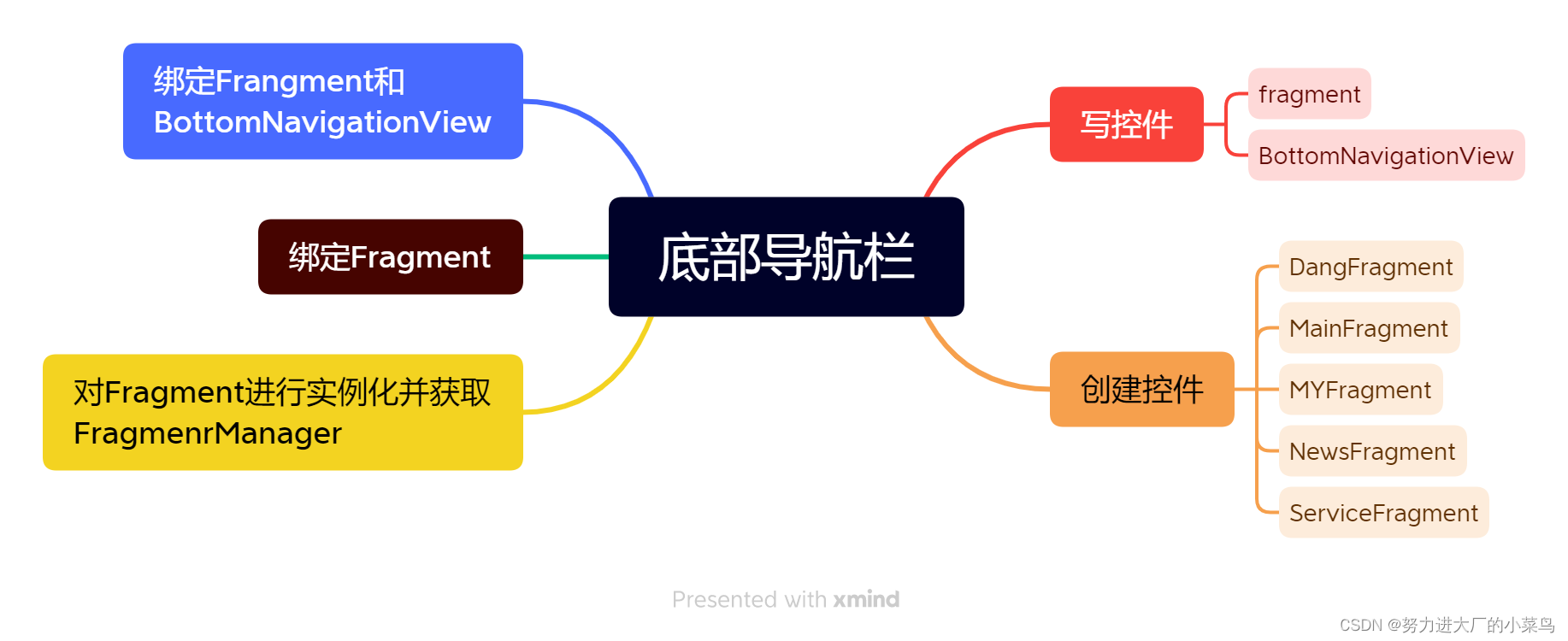 我是靠谱客的博主 合适外套,这篇文章主要介绍安卓开发——做一个简单的底部导航栏一、思维导图二、使用步骤2.创建需要的Fragment3.在MainActivity创建一个方法对Fragment进行实例化4.创建一个方法 绑定创建的Fragment5.对创建的Fragment和下面的BottomNavigationView进行绑定总结,现在分享给大家,希望可以做个参考。