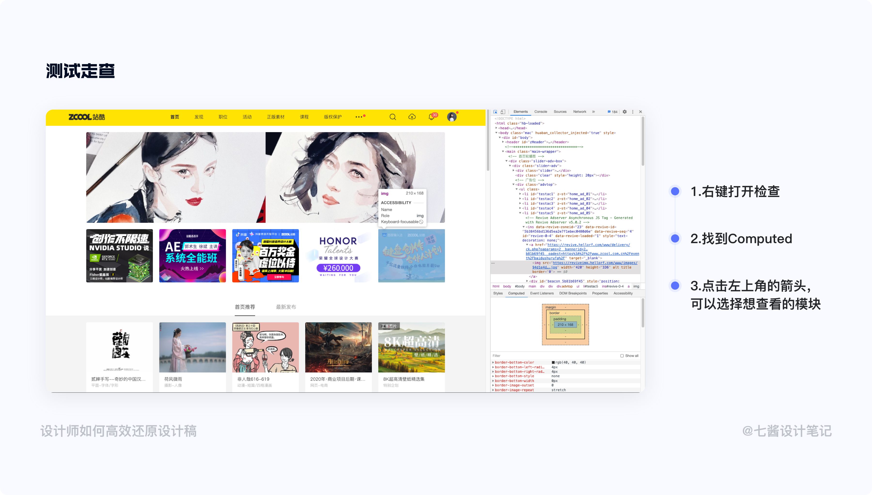 走查还原的时候,在Chrome浏览器的空白处右键点击检查,找到里面的Computed窗口,我们可以找到具体的文字、间距、投影等属性。有时候一些比较细微的调整,我们可以双击具体的数值进行调整,调整到自己满意之后再给到具体的数值给开发,这样就不用在我们摇摆不定的情况下,造成双方的困扰。