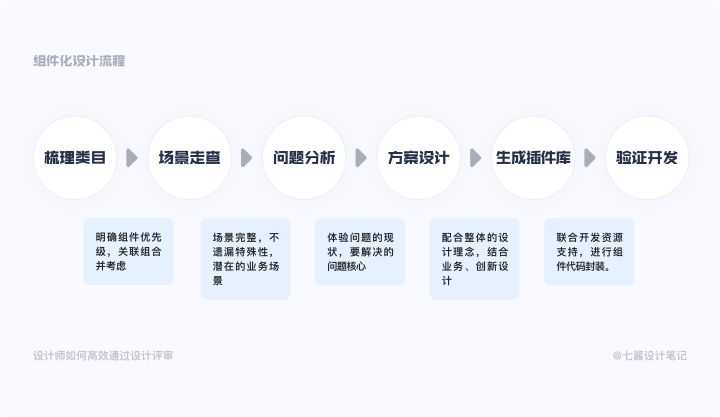 2)产品经历过0到1后,产品趋于成熟,这个时候开始做组件化。组件化搭建最多会有六个步骤,分别为:梳理类目、场景走查、问题分析、方案设计、生成插件库、验证开发。