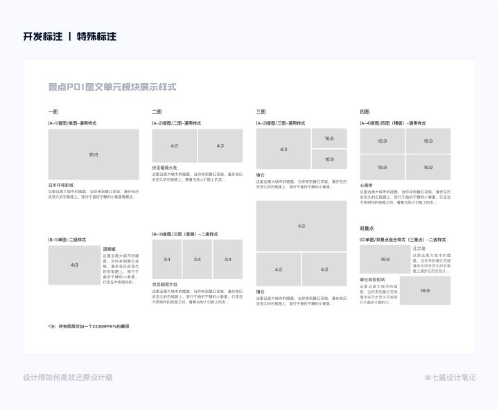 开发标注是从设计稿落地成代码的主要参考,除了蓝湖提供的标注,我们还需要写一些重要部分设计说明,例如:模块区分、局部特殊设计(该内容根据自身产品而确定)。