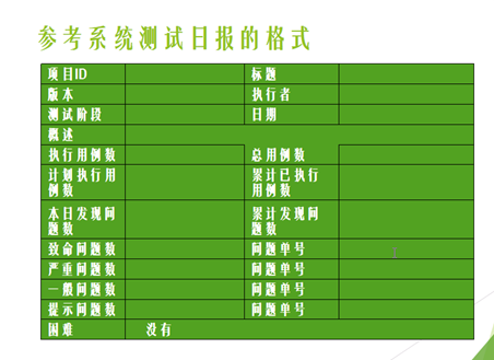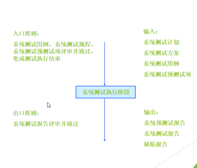 - 系统测试执行阶段:执行系统测试用例,修改发现的问题并进行回归测试,提交系统预测试报告、系统测试报告、缺陷报告