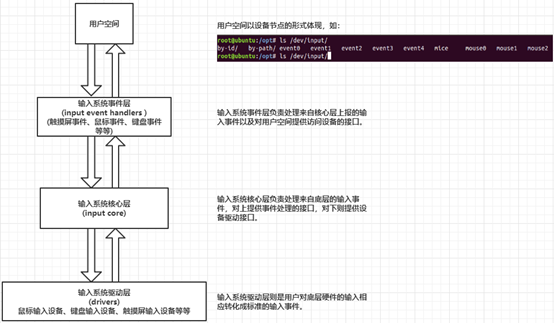 在Linux输入系统中,主要分三层进行管理,分别是input core(输入系统核心层)、drivers(输入系统驱动层)以及event handlers(输入系统事件层),如下图所示,这就是Linux输入系统的基本框架:
