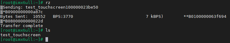接下来启动开发板,然后串口终端输出rz命令,等待接收PC端的文件,这里我们将test_touchscreen这个文件传输到开发板。