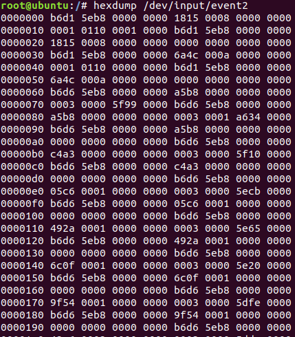 这条指令并按回车键后可以看到一堆乱码数据,这些数据我们看不懂,但是我们可以知道如果按下了按键,终端有反馈消息,这时候就知道这个事件就是我们当前操作的这个设备上报的事件,那么如何能让这些数据看得懂呢?这时候可以使用hexdump命令来读取键盘事件。
