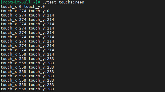 执行test_touchscreen,然后用手触摸屏,可以看到有相应的坐标值打印: