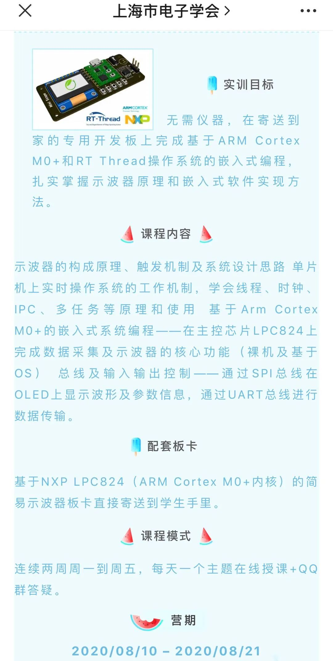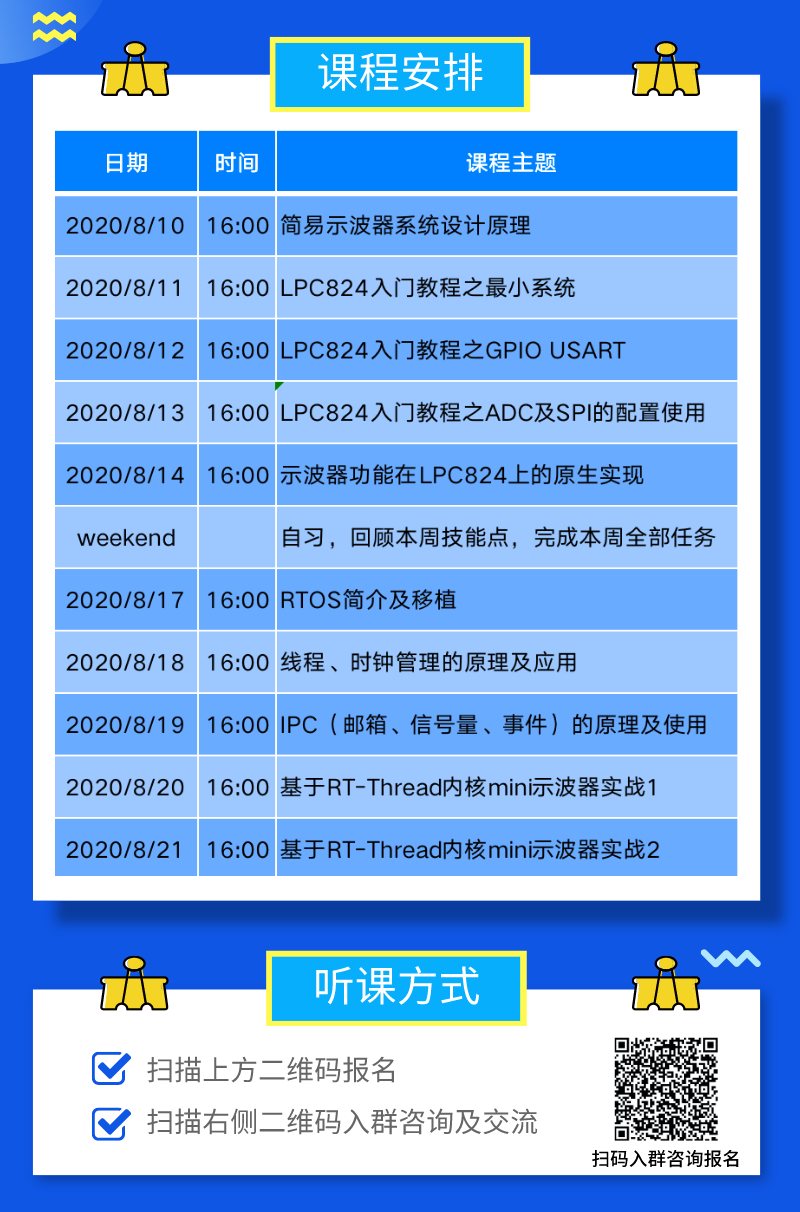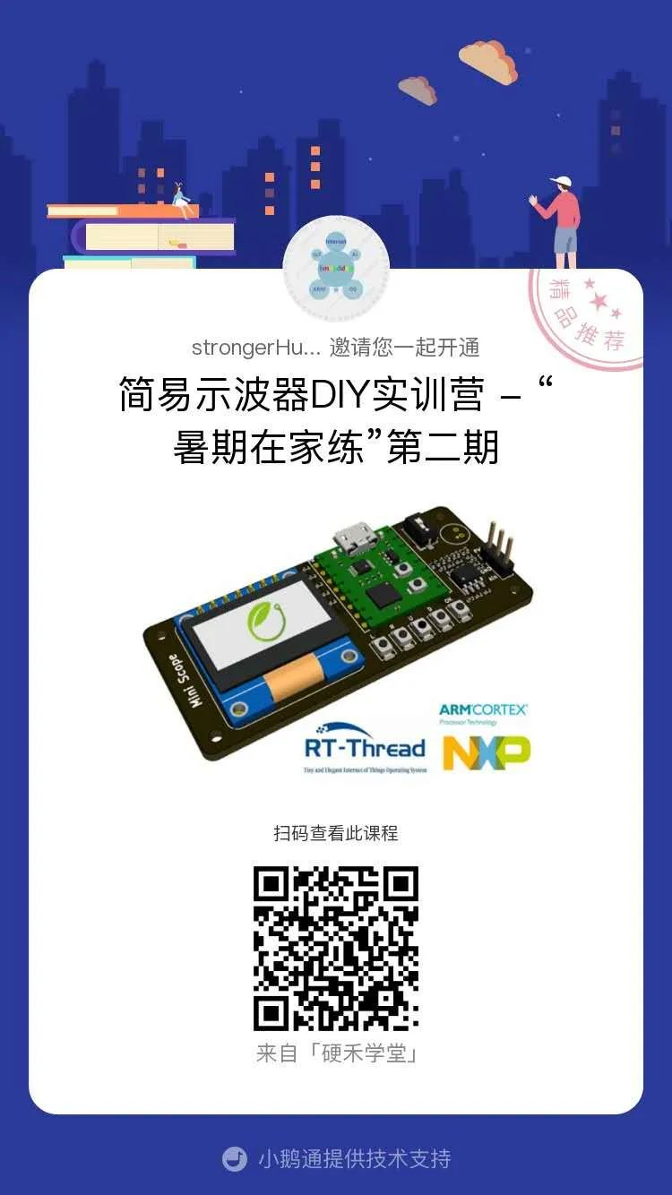 基于大量爱好者朋友们的反馈,在上海市电子学会和上海市学生事务中心的大力支持下,硬禾学堂决定联合RT-Thread、NXP于8月10号 ~ 21号举办为期两周的线上直播实战培训,带着大家完成示波器功能的同时,重点给大家梳理一下嵌入式编程的一些核心技能知识点: