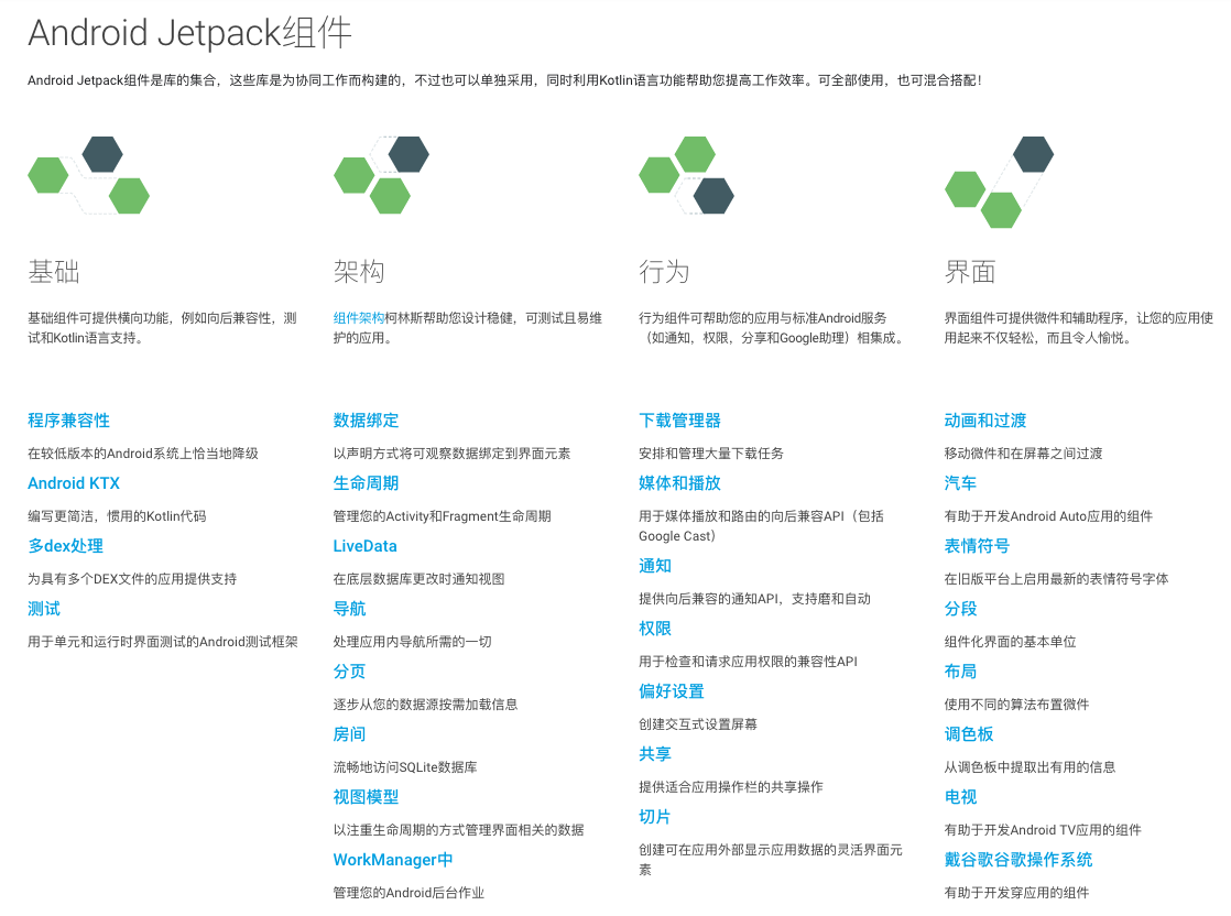 Jetpack分四个模块分别是:基础(Foundation)、架构(Architecture)、行为(Behavior)、界面(UI)