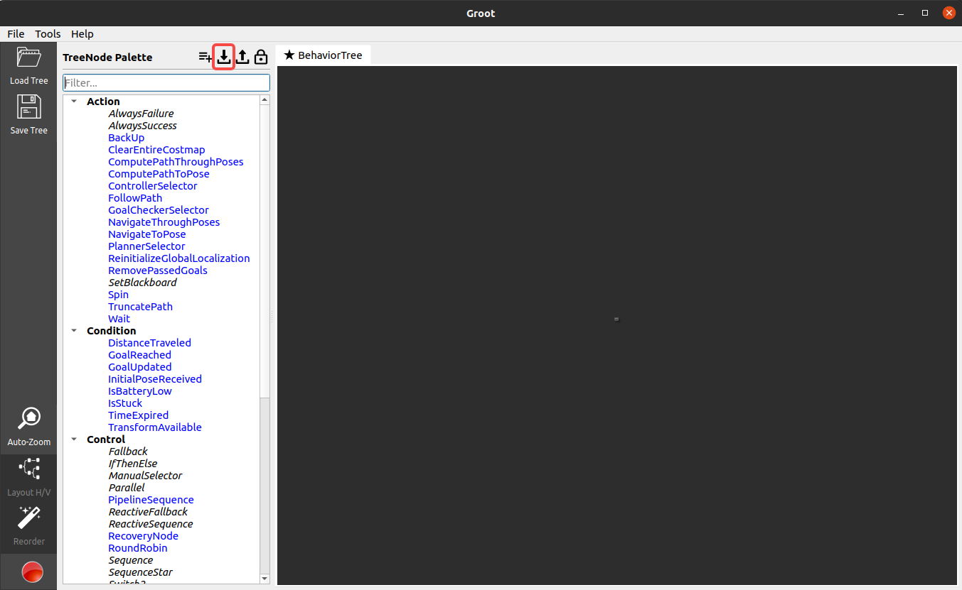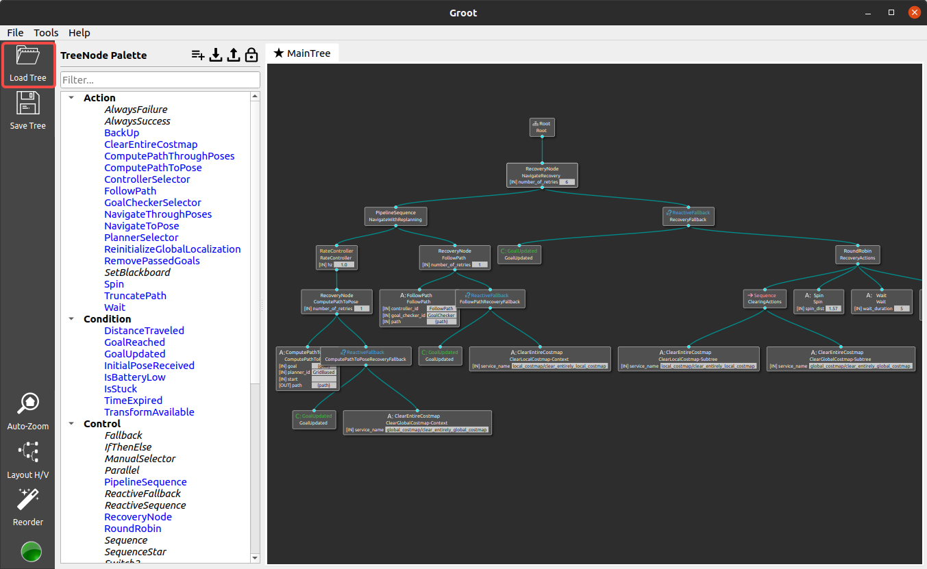 下图是加载了Navigation2中自定义的叶子节点,即其中的蓝色部分,黑色的是BehaviorTree.CPP库里自带的。加载的文件是nav2_behavior_tree/nav2_tree_nodes.xml。