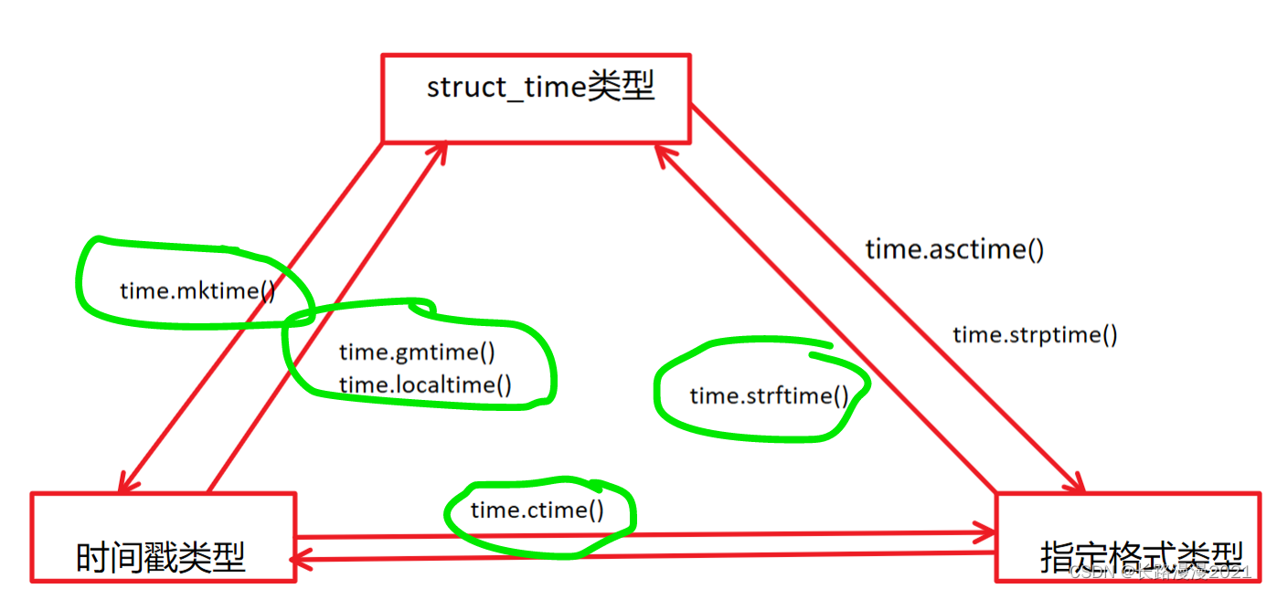 | time.gmtime([sec]) | 将时间戳类型的时间转换为UTC中的struct_time,其中dst标志始终为零 |