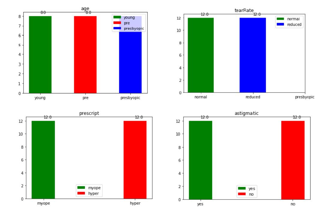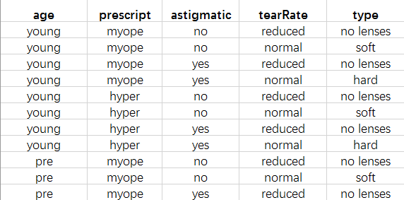 数据集中包含有患者数据,每个患者的数据中包括患者的情况有:年龄、处诊结果、散光情况、流泪量等,以及对应的医生推荐的隐形眼镜类型有:硬材质、软材质以及不适合佩戴隐形眼镜。