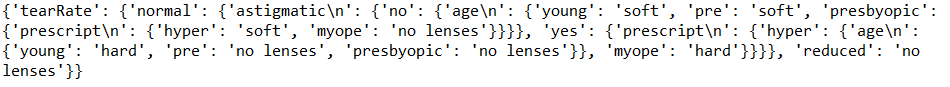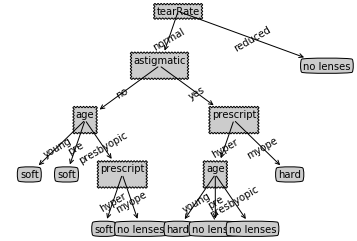 基于之前的分析,我们知道可以根据决策树学习到眼科医生是如何判断患者需要佩戴的眼镜片,据此我们可以帮助人们判断需要佩戴的镜片类型。