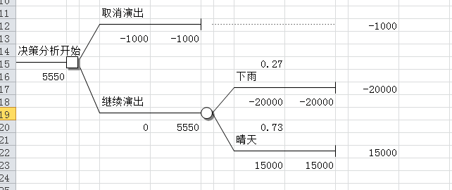 所以取消演出会损失1000块钱,继续演出会赚5550块钱。所以决策者做决策的时候会选择继续演出5550的数据就会显示早决策节点上